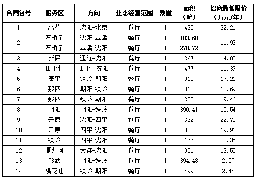 2.2招商范围及合同包划分:本次招商业态为石桥子、那四、开原服务区双侧餐厅共计6个;高花(沈阳—北京方向)餐厅1个、新民(通辽—沈阳方向)餐厅1个、康平(铁岭—朝阳方向)餐厅1个、康平北(康平—沈阳方向)餐厅1个、朝阳(朝阳—铁岭方向)餐厅1个、铁岭(四平—沈阳方向)餐厅1个、复州河(大连-沈阳方向)餐厅1个,彰武(朝阳-铁岭)餐厅1个,桃花吐(铁岭-朝阳)餐厅1个,本项目共划分为14个合同包。